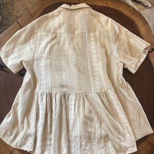 A classic button-down that is so versatile!! There are buttons down the front and 2 pockets. There is a seam along the waistline and will flare out a bit. You can throw this stunning top on with a pair of denim shorts, simple jewelry, and a pair of sandals for THE look!! You can also tuck one side and wear a pair of distressed mom jeans for a casual around town look.