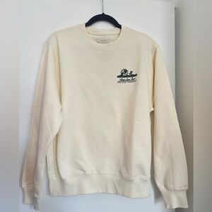 Cream Crewneck sweatshirt with printed Unisphere logo on chest and back. Ribbed neck, cuffs and waistband. Size medium. Gently worn, great condition.