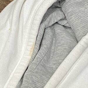 In fair condition. Weird green stains on the front and back that faded with washing but didn’t come completely out. 60/40 cotton poly.