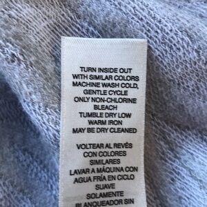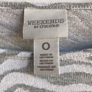 Weekends by Chico’s gray and white zebra-striped high-low 3/4-sleeve top. Chico’s size 0 (S/4 elsewhere). Good preowned condition. Crisscross detailing at neckline.