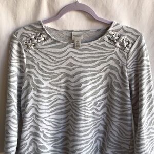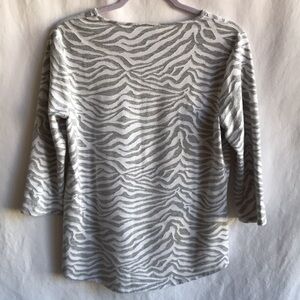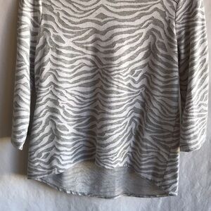 Chico’s Weekends gray and white zebra-striped high-low 3/4-sleeve top