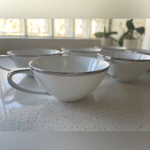 Enhance your dining experience with these elegant white Noritake china teacups featuring a sophisticated silver trim.