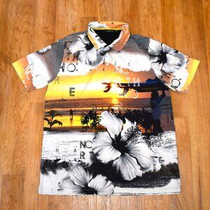 Short sleeve button front silk shirt by Tommy Bahama. Size 3XL and 100% silk. Large diamond pattern in tan/cream. In excellent used condition with no holes, tears, or stains. Comes from a smoke free home.