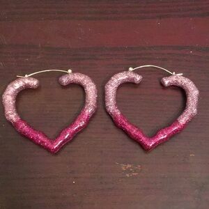 These earrings feature a unique twisted design in vibrant pink and red hues, enhanced with a glittery finish for a shimmering effect. Their large, organic shape and textured surface catch the light beautifully, making them a standout accessory.