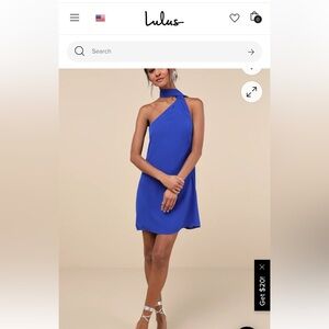 Elegant royal blue dress. Features a stylish halter neckline. Perfect for any occasion.