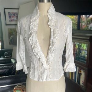 Chic white fabric with delicate ruffled edges. Ideal for creative projects. Fits like a small or medium depending on how you like to wear it. It would be a medium for off the shoulder look.