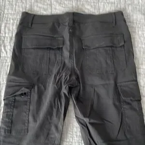 Stylish black cargo pants. Features multiple pockets. Comfortable fit.