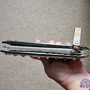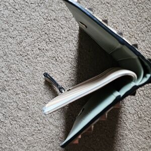 This Valentino wallet showcases a sophisticated cream and brown color palette, enhanced by edgy studded detailing along the edges. Its sleek rectangular design makes it a chic accessory for any occasion, blending luxury with modern style. Edges are all in tact with no rubbing. Snaps and zipper work. There is slight rubbing on inside as pictured.