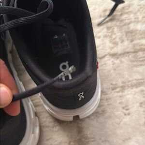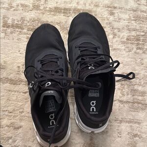 Sleek black athletic shoes with white soles. Designed for comfort and performance. Features On Running logo.
