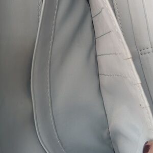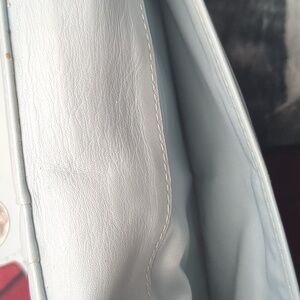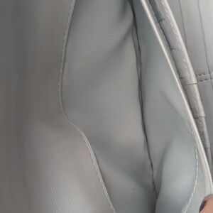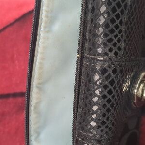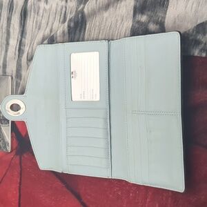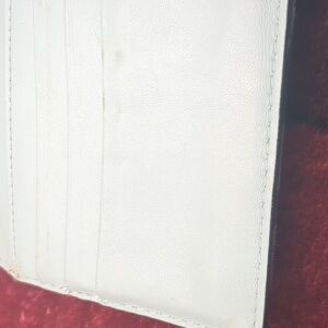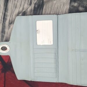 This sophisticated Coach wallet features a sleek black leather design with an embossed signature 'C' pattern, offering a touch of elegance. The envelope-style wallet is accentuated by a silver-toned clasp, adding a refined finish. Perfect for those who appreciate timeless style and quality craftsmanship. inside is mostly clean. several spots for credit cards as well as cash. the outside pocket does show dirt/ dinge in it. the cloth does also show some dinge. approximate 4 in in height by 8 in across