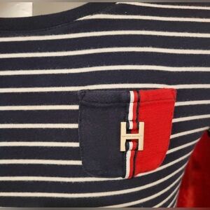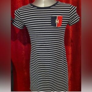 This casual sheath dress by Tommy Hilfiger features a chic blue and white color palette, perfect for everyday wear. The mini dress showcases a classic crew neck and short sleeves, offering a timeless and comfortable fit. Its simple silhouette and nautical-inspired design make it a versatile addition to any wardrobe. It says size small but it’s an xs because I had it taken in a little!