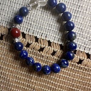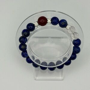 8mm natural beaded bracelet made with Lapis Lazuli, Cinnabar and Clear Quartz. The Lapis have quite a bit of pyrite inclusions. There are three silver tone flower spacers. Cinnabar bead is a little bigger than the Lapis and Clear Quartz beads (9mm). Bracelet is a size 6.5 to 7. Perfect for 4th of July.