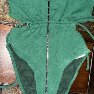 Elegant green swimsuit with a textured design. Features adjustable side ties and a square neckline.