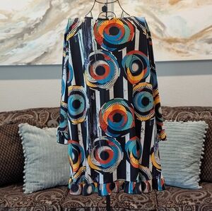 Nuggles vibrant dress with a bold geometric pattern. Features a mix of blue, red, orange, and black colors. New with tags!