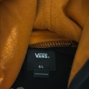 Vans hoodie featuring a striking wolf graphic. Bold black and orange colors. Unique sleeve pattern.