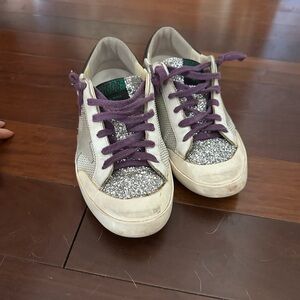 Sparkle with every step in these stylish golden goose superstar sneakers. Featuring a glittery silver star design and comfortable fit, they're perfect for any adventure. Size 38 worn a bit wear on bottom of shoes heel area. Still lots of life left good neutral golden goose sneakers also discoloration on insoles please see pictures