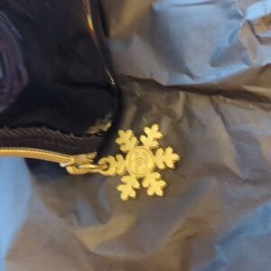 Sleek black CHANEL Beauté pouch. Glossy finish with gold snowflake zipper charm. Ideal for makeup storage. New in original packaging. Never used, super shiny patent leather.