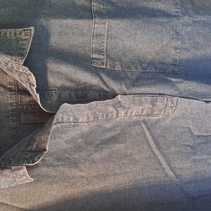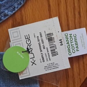New with tags Liz Claiborne Simply Liz colkection, size XL, casual blue denim like organic cotton blouse shirt. Features organic cotton fabric, long sleeves with button cuffs, chest pocket, shirt tail hem, side vent detail, open V neck with no buttons, and a classic collar, and back pleat Light blue denim color. lightweight breathable fabric. Pull on over the head style. relaxed fit. confort and style in one blouse/shirt. Great new condition. perfect for year-round wear.