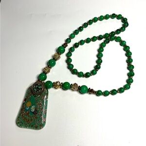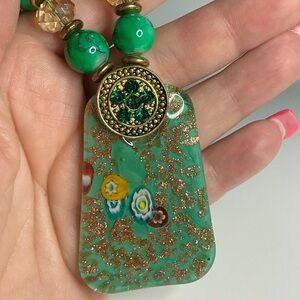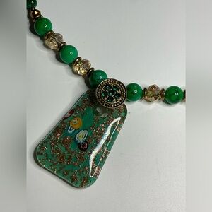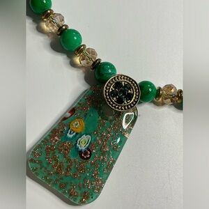This stunning necklace showcases a harmonious blend of green and gold, featuring an beautiful Millefiore pendant. The pendant's unique shape and marbled green finish are beautifully accented by gold-toned patterns, offering a sophisticated touch. Strung on a matching beaded chain, this piece exudes timeless elegance.