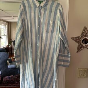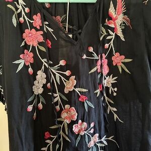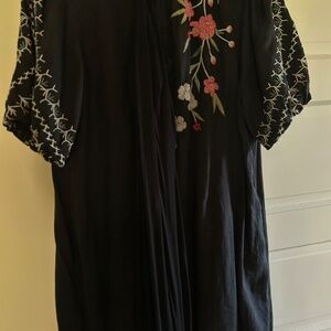 This black dress with beautiful embroidery around the neck, the back, and the sleeves is new with tags attached. It has a slip under it because it is slightly see-through. It has two sets of ties at the neck and is just beautiful unfortunately it’s a little short for me because I am very tall And I have ugly legs. The dress is about 40” in the front and about 43” in the back. Really cute dress.