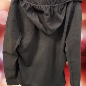 Stylish black hooded jacket with a sleek design. Features a front zipper and pockets.