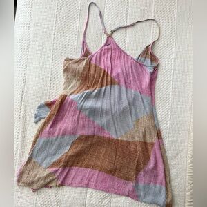 Designed for warm days, this lightweight woven dress boasts a fun, patchwork-style pattern across the wrap silhouette that ties at the side for a customizable fit. Slender adjustable straps create a racerback design that completes the effortless mini design. Metal logo tag at back, internal button closure, and modesty clasp.