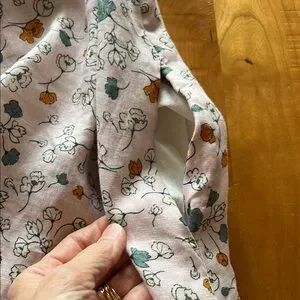 Charming sleeveless dress with a floral pattern. Features a mix of orange, green and white flowers on a light pink background.
