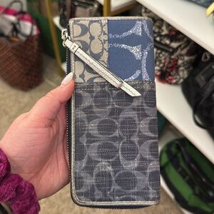 This Coach wallet showcases a sophisticated blend of blue and gray hues in a modern patchwork design. Crafted with the brand's signature monogram and metallic hardware, it offers a stylish way to carry your essentials. The zip-around style and wristlet strap add convenience and elegance to your everyday look.