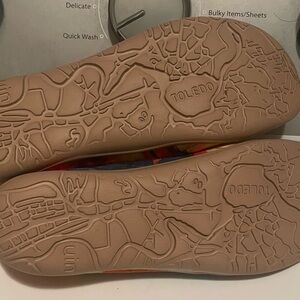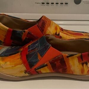 Experience the perfect blend of comfort and style with UIN's vibrant flats, featuring a stunning abstract design in red and orange hues.