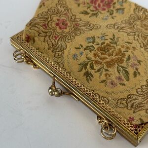 This elegant floral tapestry clutch features a beautiful gold chain, perfect for adding a touch of vintage charm to any outfit. The intricate design showcases a blend of colors, making it a versatile accessory for various occasions.