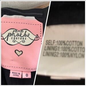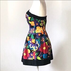 This lined strapless sundress by Phoebe Couture has a cute and quirky floral print. It features black grosgrain ribbon trim, an exposed gold back zipper, and light crinoline under the full skirt. It's a fun flattering dress with conveniently hidden pockets. Light boning throughout the bodice. Beautiful embossed quality material. 100% Cotton; Lining 1: 100% Cotton Lining 2: 100% Nylon. Great party dress! See last photo for measurements