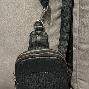 Sleek and stylish black vegan leather sling bag, perfect for everyday use. Features a comfortable strap and secure zip closure.