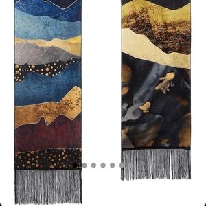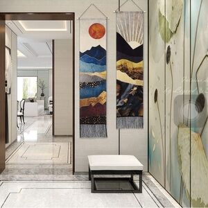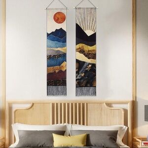 Trending indie/mandala/hippie tapestry banner & wall art! Features colorful bohemian mountain range, & full sun/sunset backdrop. Rustic vintage colors. Chic tassels line the bottom. Perfect for nature/outdoor lovers.