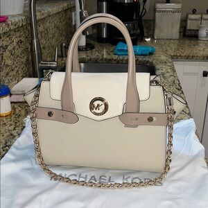 NWT Authentic Michael Kors Jet Set Signature Handbag 16X16. Inside has zippered and slip pockets. Long shoulder straps.