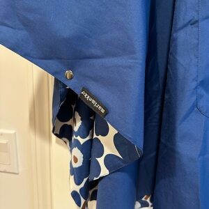 Chic blue poncho with bold floral design. Ideal for stylish outings in the rain! Has a front pocket, drawstring hood, and quarter button down front.
