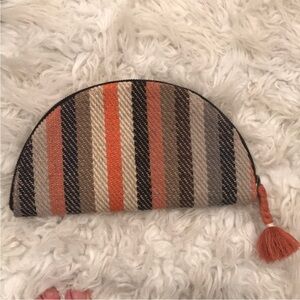 This charming clutch from the Universal Thread brand features a zipper closure adorned with a super cute peach-colored tassel. The multicolored design includes peach, orange, tan, beige, and blue hues, making it perfect to complement any outfit.