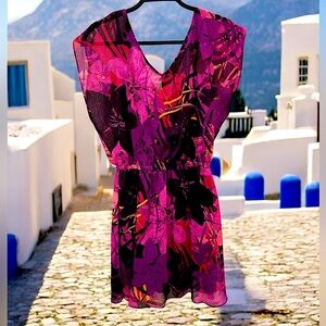 ** This Express brand dress features a vibrant floral print in shades of fuchsia, violet, and red set against a sheer overlay. The sleeveless design is styled with a flattering V-neck and an elastic cinched waist that enhances the silhouette. Lightweight and breezy, it’s perfect for warm-weather occasions, offering a bold yet feminine look ideal for outdoor events or summer getaways.