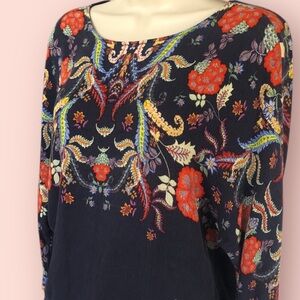 Fits up to Large. This Desigual blouse features a striking graphic design with a navy blue and black base, adorned with vibrant coral accents. The blouse showcases a unique symmetrical pattern cascading from the neckline, offering an elegant and bold look. Perfect for making a statement, this top combines style and sophistication effortlessly.The DESIGUAL Bohemian Floral Paisley 3D print Small Top Blouse in black with 3/4 sleeves is a stylish and versatile piece perfect for casual outings. Made from viscose, the blouse features a round neckline, pullover closure, and a regular fit. The bohemian floral pattern adds a touch of nature-inspired charm, making it a great option for the summer and spring seasons. With its blend of colors and themes, this blouse is sure to add a unique flair to any outfit, whether you're going for a retro, hippie, or preppy look.