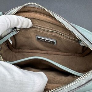 This elegant crossbody bag from Tory Burch features a structured design in a refreshing green hue. Crafted from high-quality leather, it boasts a signature silver-toned logo on the front flap and an adjustable strap with chain accents. Its minimalist style and versatile color make it a perfect accessory for any occasion.
