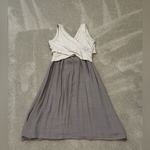 Chic sleeveless dress with a stylish two-tone design of neutrals. Features a cream criss cross top and light grayish/brown skirt. Perfect for any occasion. Lined. EUC, smoke free home.