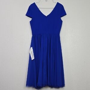 Features: Blue crepe V-neck dress and cap sleeves featuring a chiffon skirt with loads of flair. Lined with hidden back zip closure.