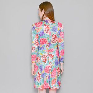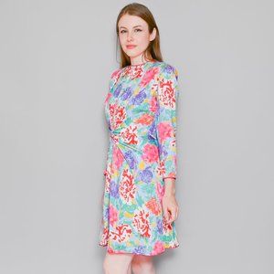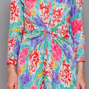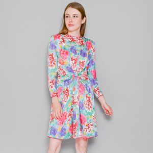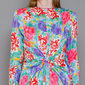 Vintage long-sleeve dress by Collection by Mary McFadden. Multicolor floral print silk. Twist front design. Invisible back zipper closure. Has shoulder pads, which could easily be removed. Made in USA.