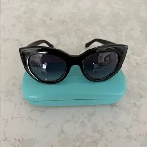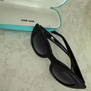 These chic sunglasses from Kate Spade feature a bold black cat-eye frame with a glossy finish, perfect for making a fashion statement. The dark lenses provide excellent sun protection, while the included blue case ensures safe storage and adds a pop of color.