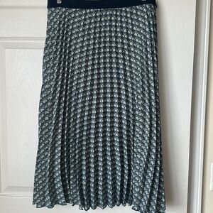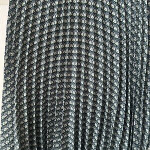 This sophisticated A-line skirt by Max Studio showcases a timeless blue, green and white Ikat type pattern. The midi length and elegant pleats make it perfect for both work and cocktail occasions. Its classic design ensures a graceful drape and movement, adding a touch of refinement to any ensemble.