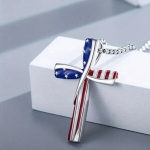 Show your pride with this bold American flag cross pendant necklace, crafted from durable silver-tone alloy. The pendant features a striking red, white, and blue enamel design with stars and stripes, symbolizing faith and patriotism in one meaningful piece.