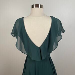 Features: Chiffon V-front and back wrap dress with ruffle trim, floor length