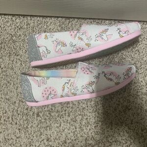 TOMS slip-ons with shimmering glitter finish. Soft pink accents add charm.