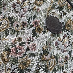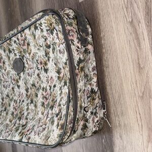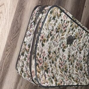 Elegant floral tapestry suitcase with a vintage design. Features a mix of pink, green, and cream colors.