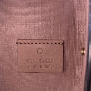 This elegant Gucci wallet showcases a refined cream and pink color scheme, adorned with the iconic GG monogram. The pink leather trim enhances its sophisticated appeal, making it a perfect accessory for any stylish ensemble.