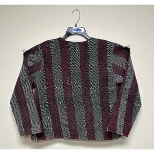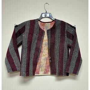 Add bold texture and contrast to your wardrobe with this handwoven striped jacket by Blink Buy. Designed with alternating vertical panels in rich burgundy, deep black, and ivory tones, this piece brings a timeless yet modern aesthetic. The open-front silhouette is framed by soft maroon piping and showcases a warm, intricately stitched interior lining that adds dimension and charm. A closer look reveals delicate embroidered details and subtle patchwork, emphasizing its artisanal craftsmanship.